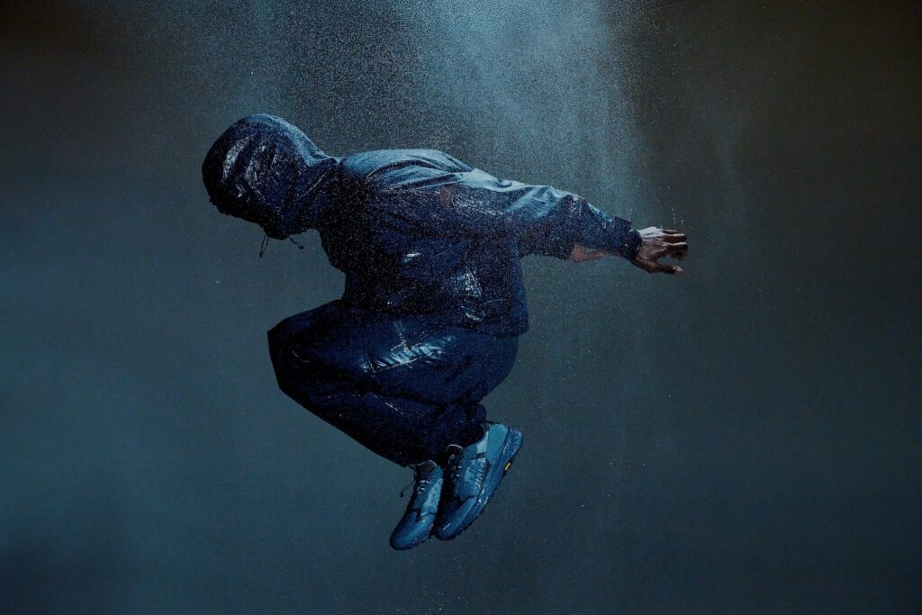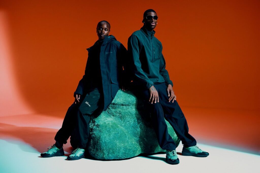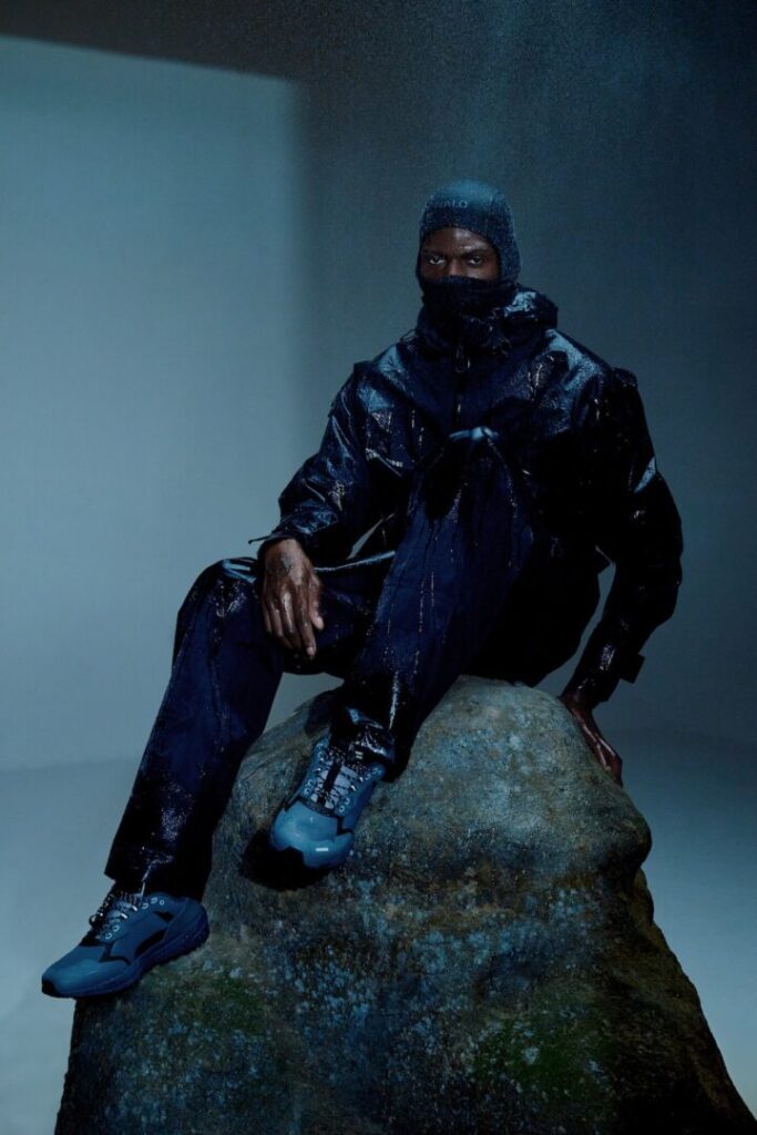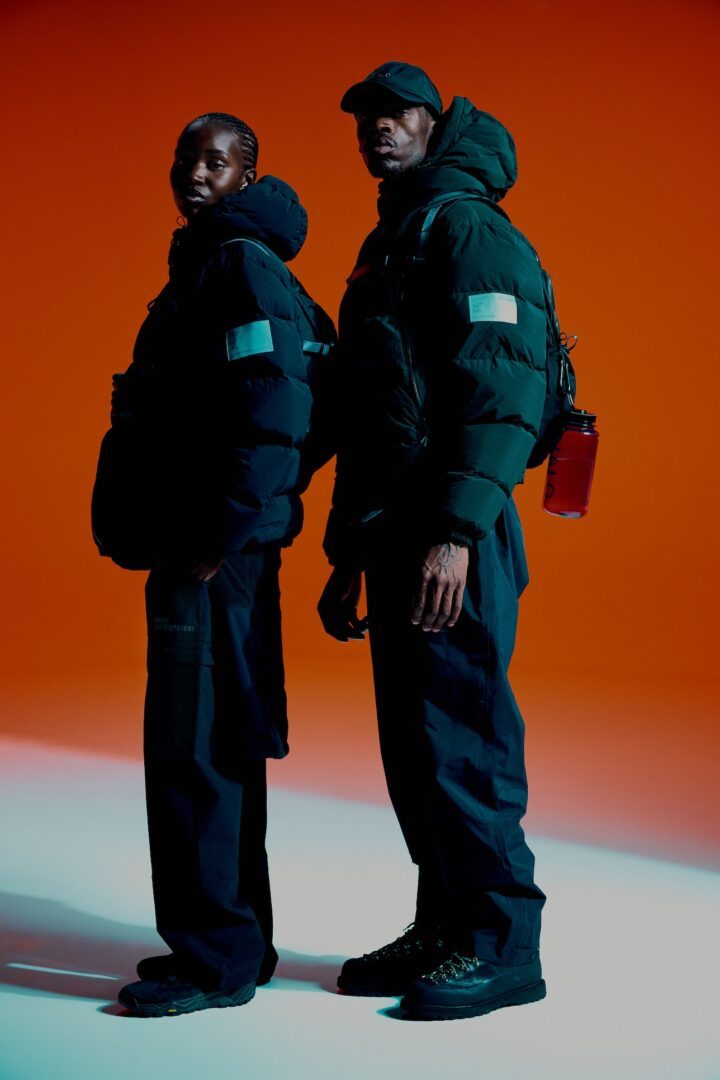 Leichte, widerstandsfähige Materialien bilden die Basis. Wind- und wasserabweisende Finishes, justierbare Details und Ripstop-Strukturen geben der Linie Substanz. Dazu kommen markante Allover-Prints, die von Fallschirmen inspiriert sind. Farblich hält HALO die Balance zwischen Funktion und Ausdruck – mit tiefem Bordeaux und robusten Grautönen.