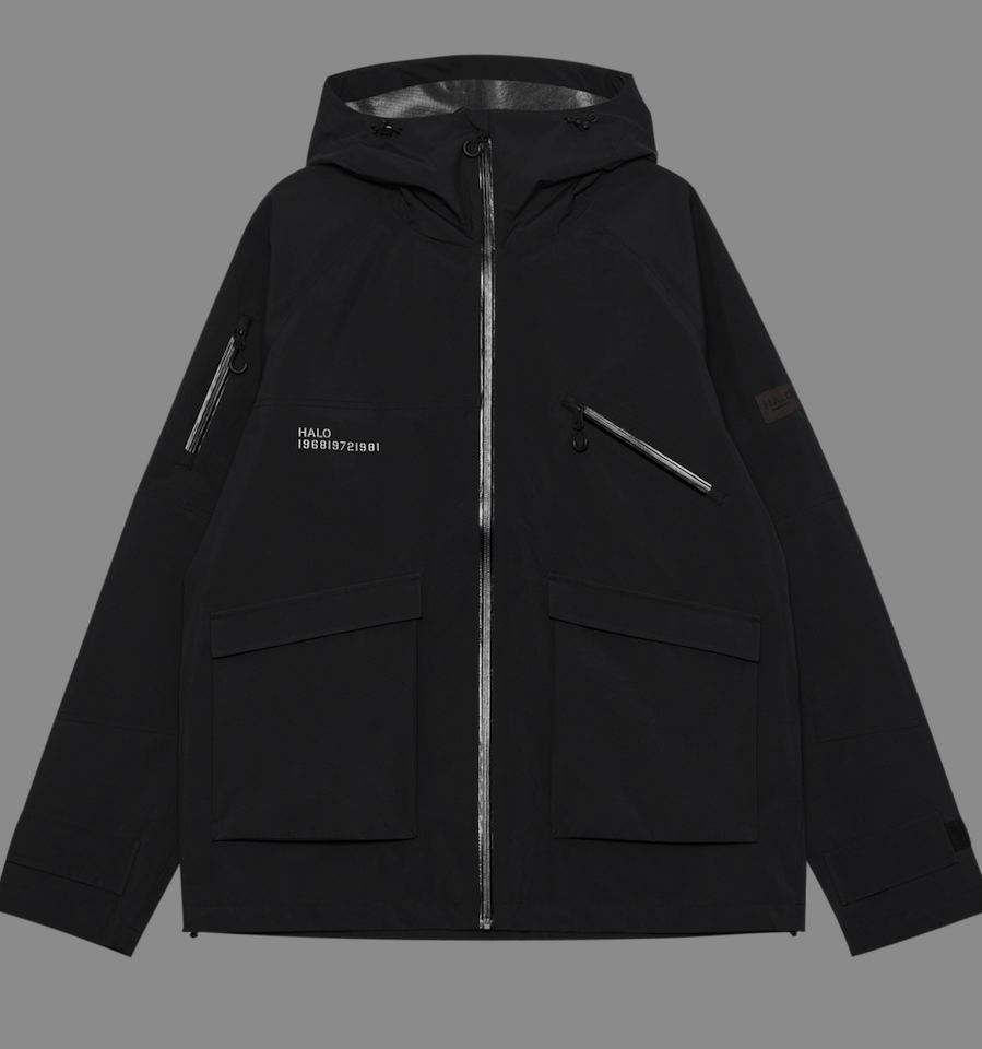 Ein technisches 3-Lagen-Modell mit verklebten Nähten, Sturm-Manschetten und fluorfreier BIONIC-FINISH® ECO-Imprägnierung. Mit 10.000 g/m² Atmungsaktivität und 15.000 mm Wassersäule ist sie für ernsthafte Wetterlagen gebaut. Verstellbare Kapuze, Velcro-Cuffs, Cargo- und Zip-Pockets plus reflektierender HALO-Print machen sie zum Statement-Piece der Saison.