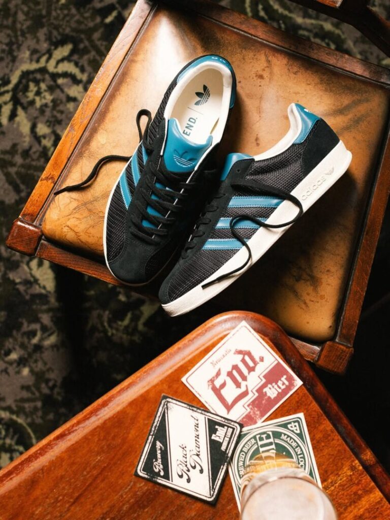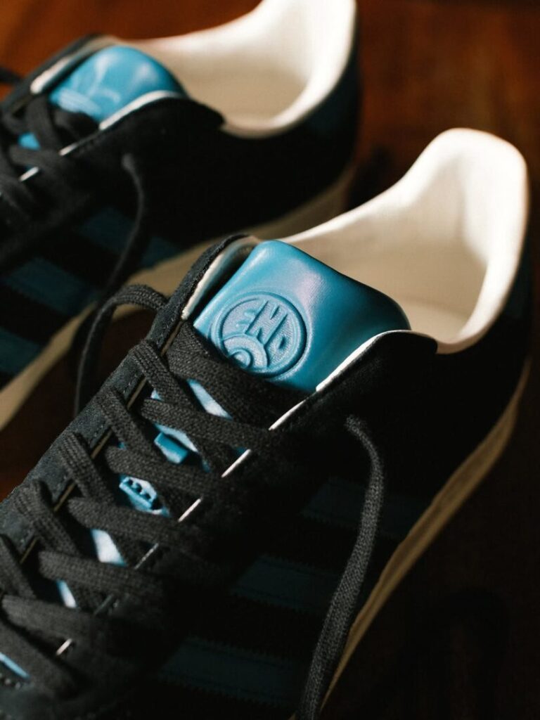 Die Capsule Collection ehrt diese urbritische Verbindung von Community und Kickabout mit einer vierteiligen Auswahl, die vom Bolzplatz bis zur Bar funktioniert. Im Mittelpunkt steht die Gazelle Indoor Pro – ein Klassiker der adidas-Terrace-Kultur, der hier in Schwarz, Weiß und Teal daherkommt. Die Farbgebung ist ein direkter Gruß an die Trikots von END.s Heimatclub, während END.- und adidas-Logos an Ferse, Zunge und Innensohle subtil an die Zusammenarbeit erinnern. Ein Mesh-Upper sorgt für modernen Touch, während Wildleder-Details an Zehenbox und Ösen die DNA des Originals bewahren.