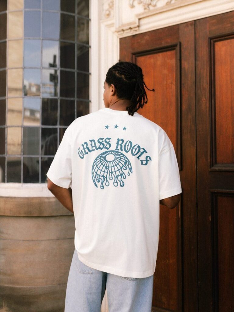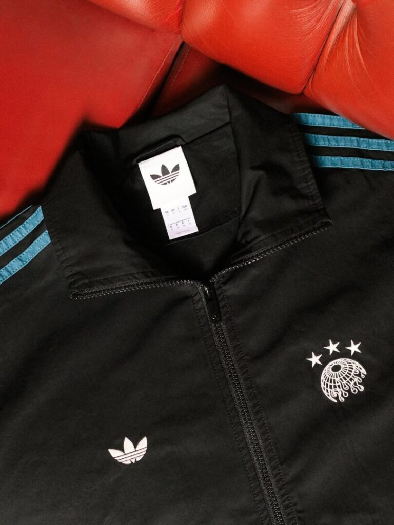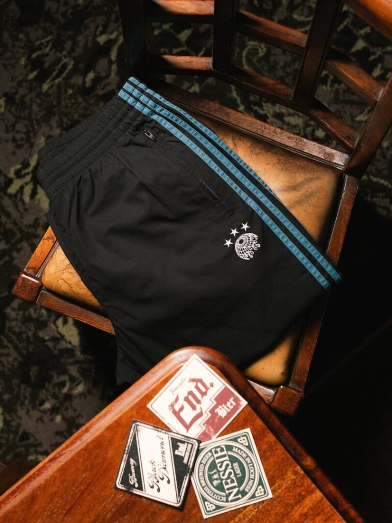 Dazu gibt’s ein passendes Tracktop und Trackpants, selbstverständlich mit Teal-Stripes, Kettenstickerei und jeder Menge Throwback-Flair. Der Schriftzug „Grass Roots“ ziert Brust und Tasche – eine Hommage an die lokale Fußballkultur, die END. groß gemacht hat. Abgerundet wird das Ganze von einem Graphic Tee, das sowohl die Capsule feiert als auch END.s 20-jähriges Jubiläum würdigt.