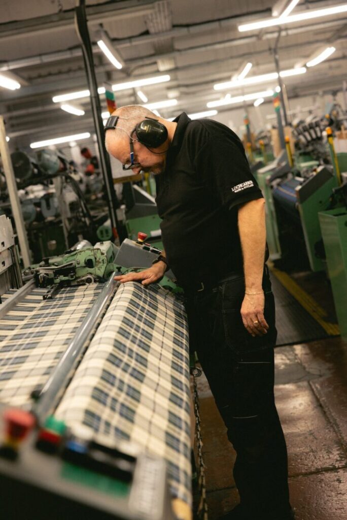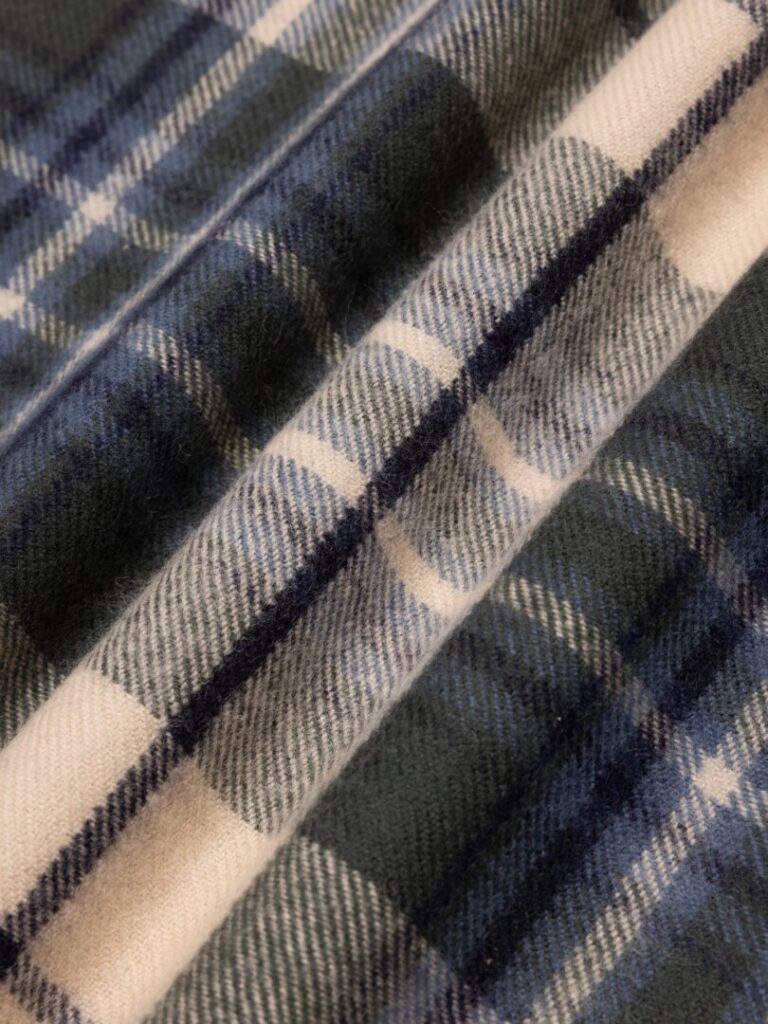 In Zusammenarbeit mit den Webern von Lochcarron of Scotland entstand ein Muster, das die DNA der Marke perfekt einfängt: Dunkles Navy und Waldgrün für Meer und Landschaft, Himmelblau für die Weite, ein Hauch Ecru als Lichtblick. Zusammen bilden sie ein Farbbild, das Schottlands Seele einfängt – vom rauen Küstenwind bis zum klaren Winterhimmel.