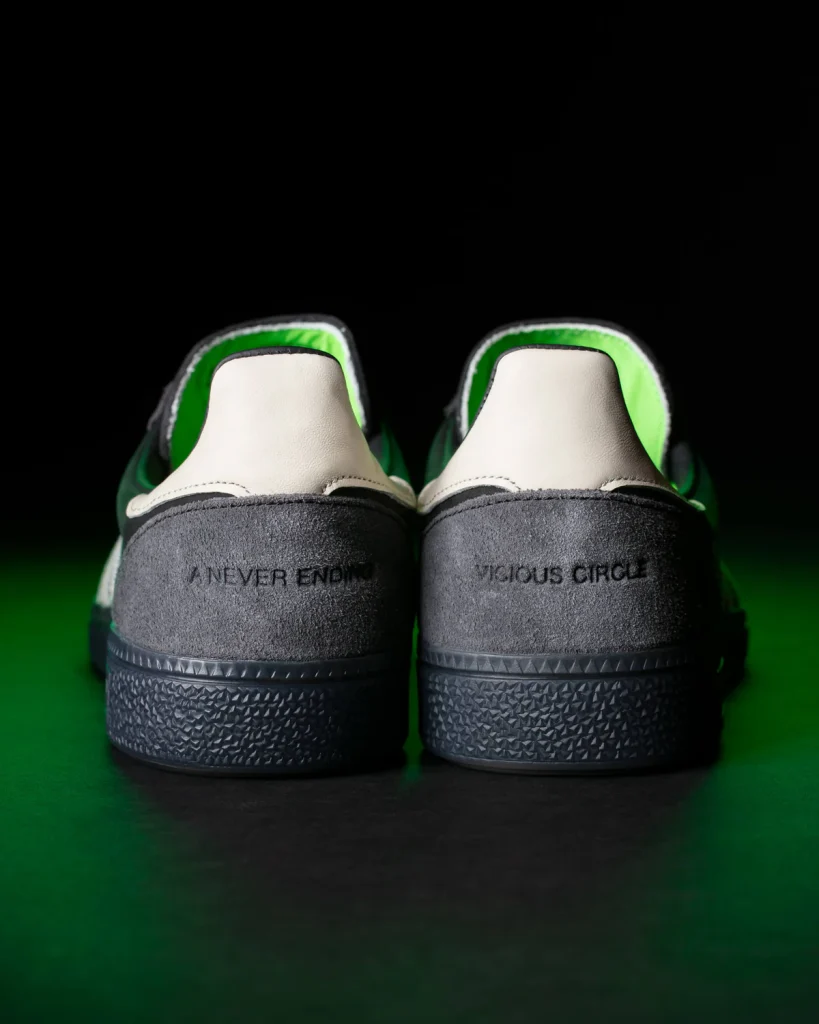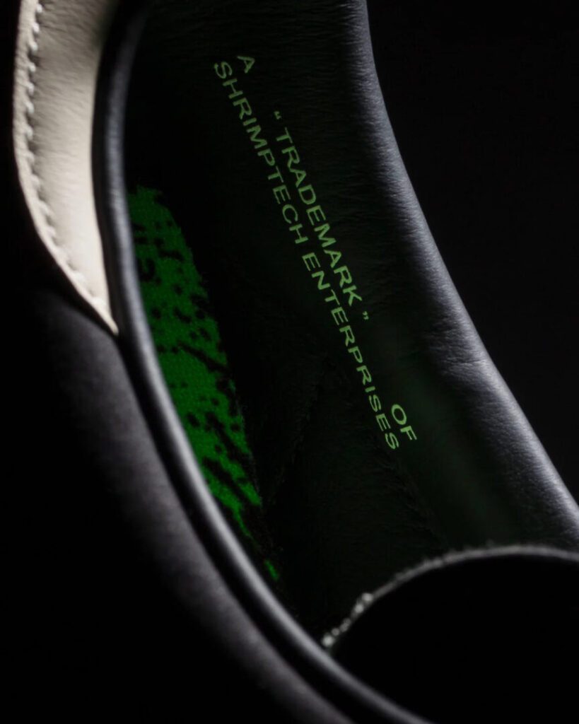 Optisch bleibt der SNS GT II “Viagra Boys Edition” auf den ersten Blick klassisch: genarbtes Leder, Velours-Overlays, Retro-Laces. Doch wer genauer hinschaut, entdeckt die Details, die dem Schuh seine DNA geben: Heel-Tabs mit dem Schriftzug Never Ending Vicious Cycle, ein Shrimptech-Sample Stamp im Inneren und subtile Hinweise auf den verdrehten Humor der Band.