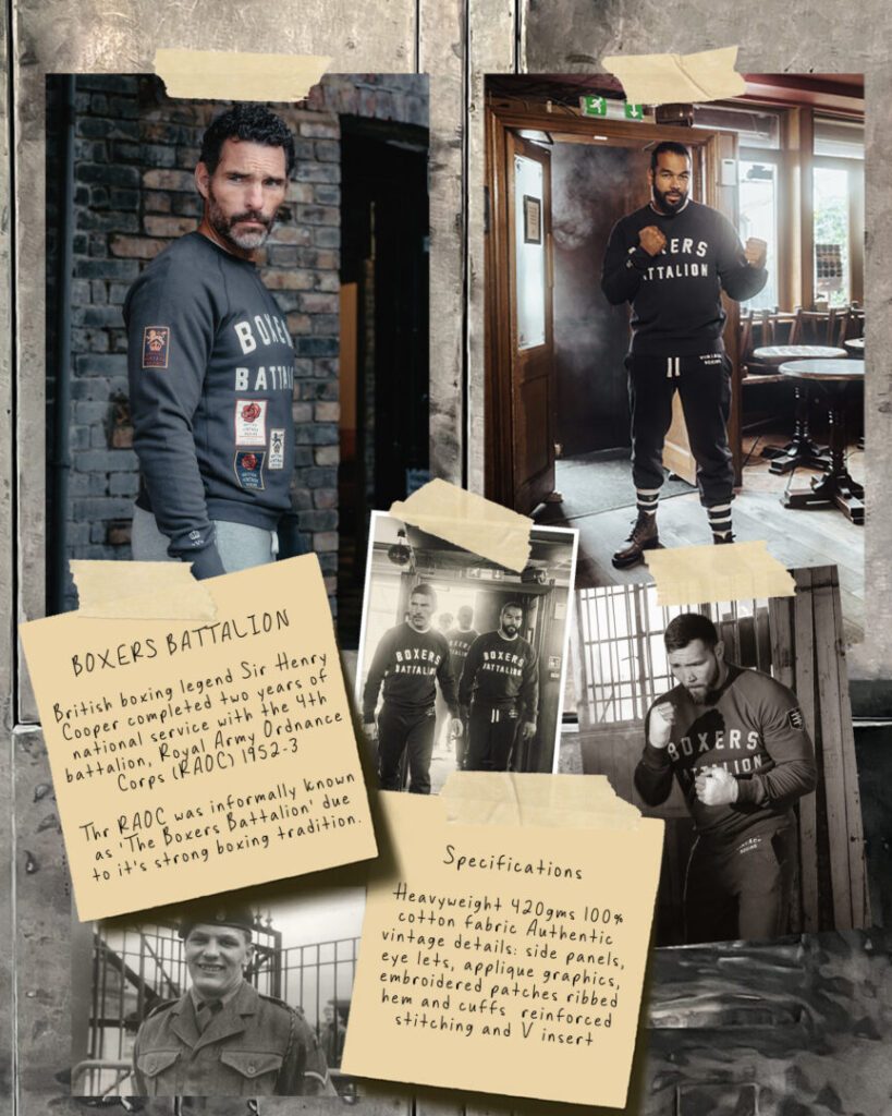 Die „Boxers Battalion“-Kollektion zitiert die legendäre 4. Trainingsbataillonseinheit des Royal Army Ordnance Corps, in der Cooper diente. Die Applikationsschrift auf den Sweats wirkt wie ein Fundstück aus alten Armeebeständen. Vielleicht für meinen Geschmack hier und da zwei Patches zu viel, aber die Kernidee ist sicherlich zu erkennen.