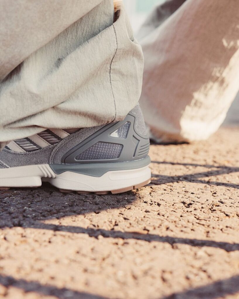 Was hier auf den ersten Blick wie „einfach nur grau“ wirkt, entpuppt sich bei näherem Hinsehen als ziemlich fein austariertes Spiel mit Materialien und Texturen. Suede trifft auf gestreiftes Nylon, reflektierende Overlays blitzen genau dann auf, wenn man sie braucht, und die drei Streifen kommen in einem angenehm unaufgeregten Greige daher – irgendwo zwischen Grau und Beige, genau richtig, um nicht zu dominieren.